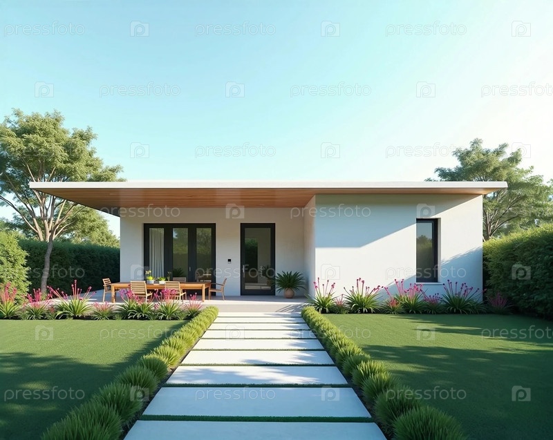 Одноэтажный стильный дом в облагороженном саду с цветами деревьями
