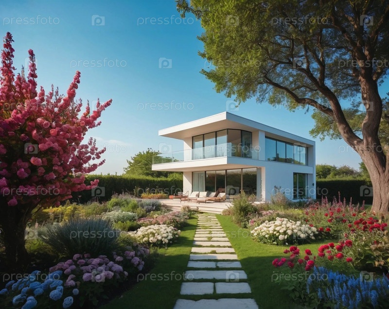 Двухэтажный стильный дом в облагороженном саду с цветами деревьями