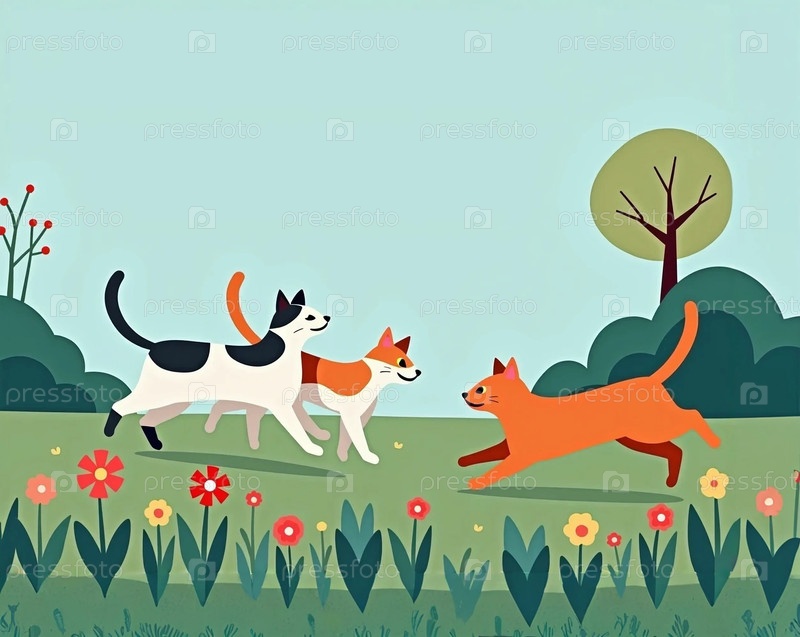 Коты бегают в летнем саду с цветами и деревом