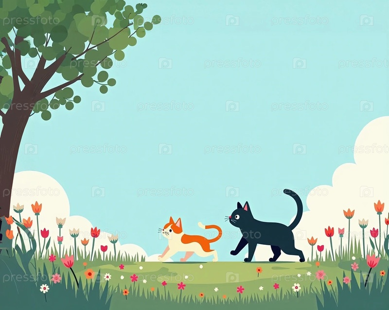 Коты бегают в летнем саду с цветами и деревом
