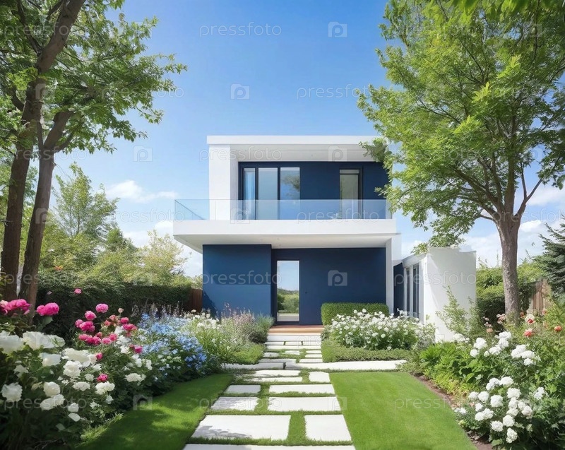 Одноэтажный стильный дом в облагороженном саду с цветами деревьями