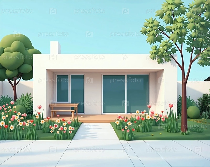 Одноэтажный стильный дом в облагороженном саду с цветами деревьями