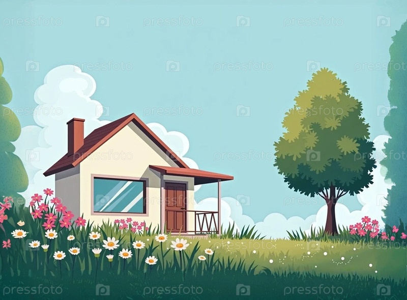 Одноэтажный стильный дом в облагороженном саду с цветами деревьями