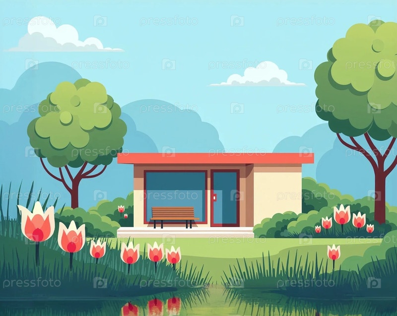 Одноэтажный стильный дом в облагороженном саду с цветами деревьями