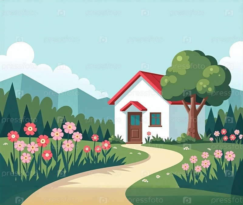 Одноэтажный стильный дом в облагороженном саду с цветами деревьями