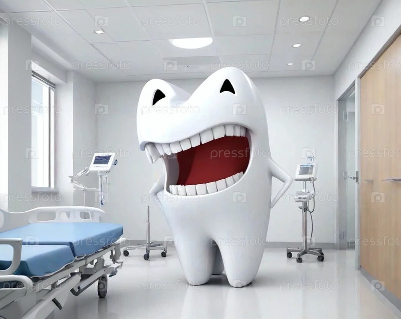 Зуб стоит на полу на фоне стены в больнице и улыбается