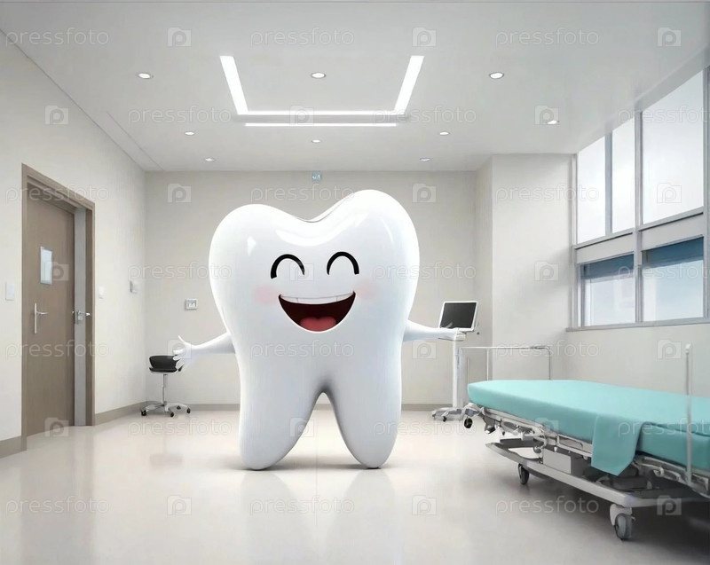 Зуб стоит на полу на фоне стены в больнице и улыбается