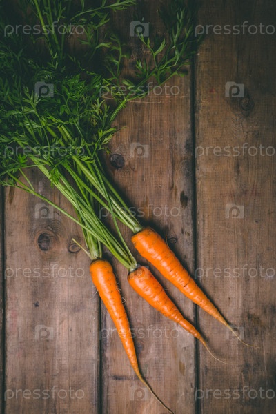 Свежая вкусная морковь на деревянном деревенском столе. Здоровая еда. Овощи