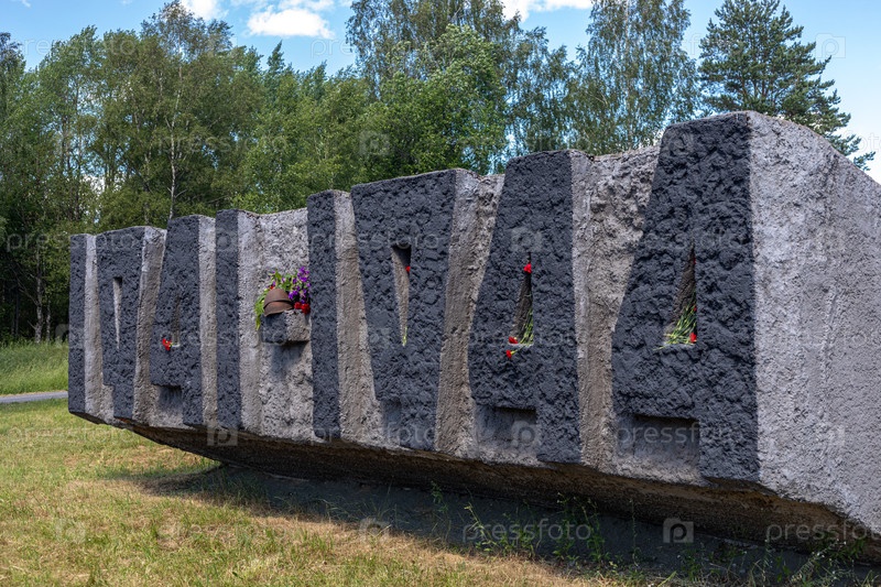 Фрагмент мемориального комплекса «Лемболовская твердыня» в солнечный день. Горизонтальный монолит с датами обороны Ленинграда «1941-1944». Ленинградская область