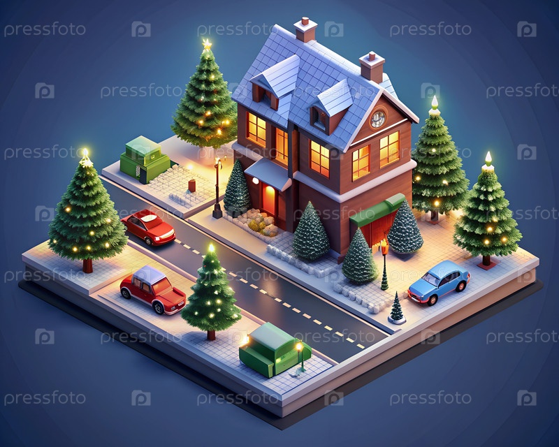 Новогодний рождественский изометрический вид, демонстрирующий шумные улицы,