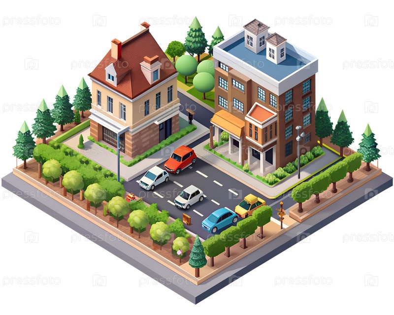 Трехмерный изометрический вид, демонстрирующий шумные улицы,