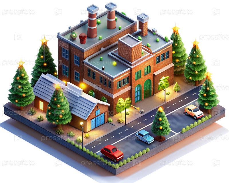 Новогодний рождественский изометрический промышленный завод и складское логистическое здание