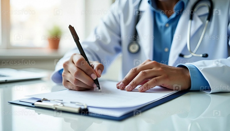Доктор пишет медицинский отчет на буфере обмена в больничном офисе