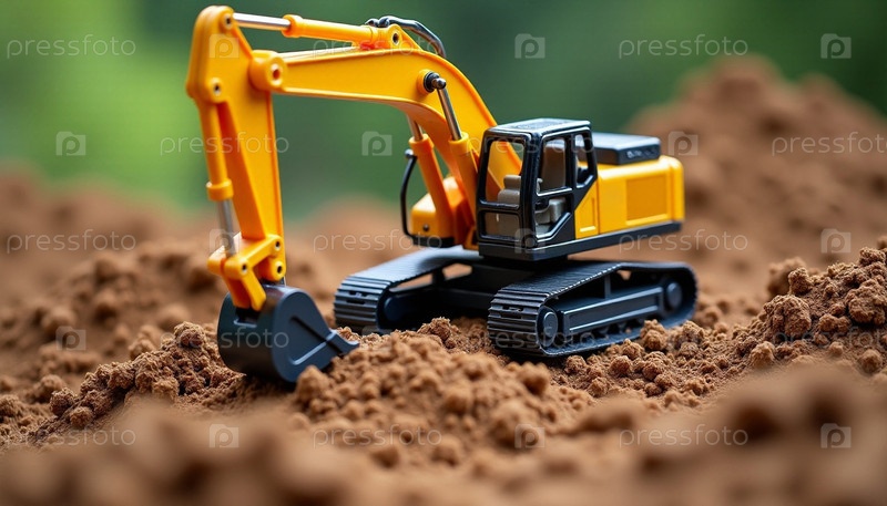 Желтый игрушечный экскаватор копает землю на строительной площадке