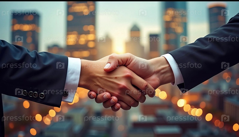 Бизнесмены пожимают руки перед горизонтом города на закате