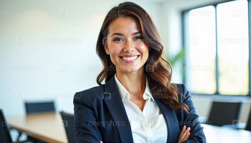 Уверенная в себе бизнесвумен улыбается со сложенными руками в офисе зала заседаний