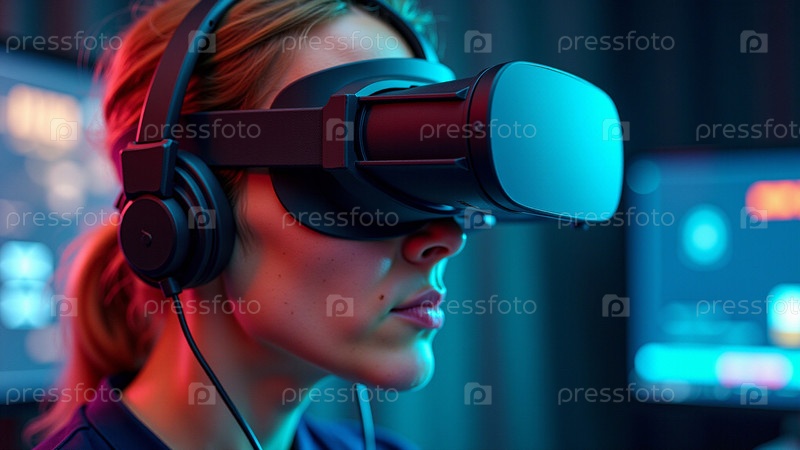 Инженер-программист в гарнитуре vr исследует виртуальную реальность в неоновом свете