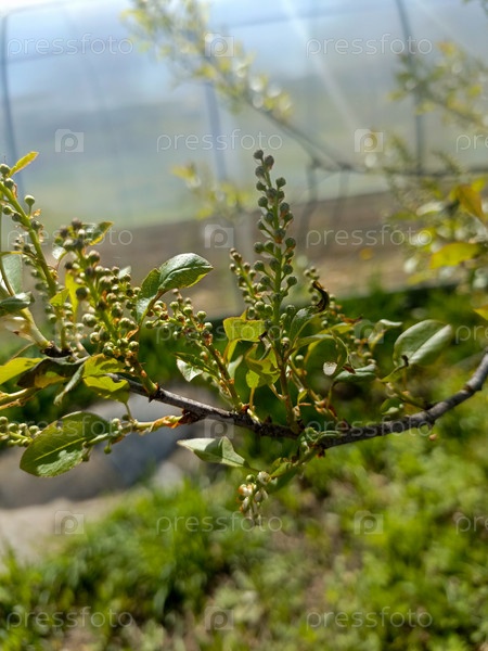 Цветущие весенние почки и ярко-зеленые листья на ветвях черемухи в оптимистичном настроении Символизируют Новый рост на размытом фоне теплицы