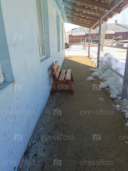 Деревянная скамейка под навесом у голубой стены