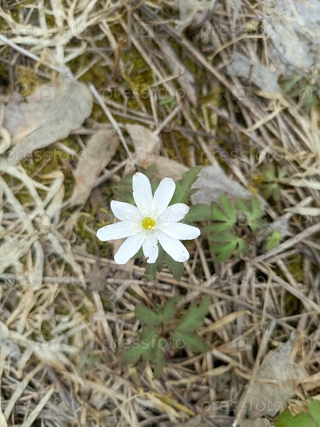 Одинокая белая деревянная анемона, цветущая в листовой подстилке с мелкой глубиной поля