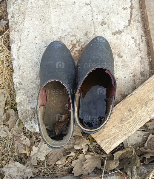 Старые засорения, заполненные водой, покоящейся на бетонной поверхности в естественной наружной обстановке возле опавших листьев