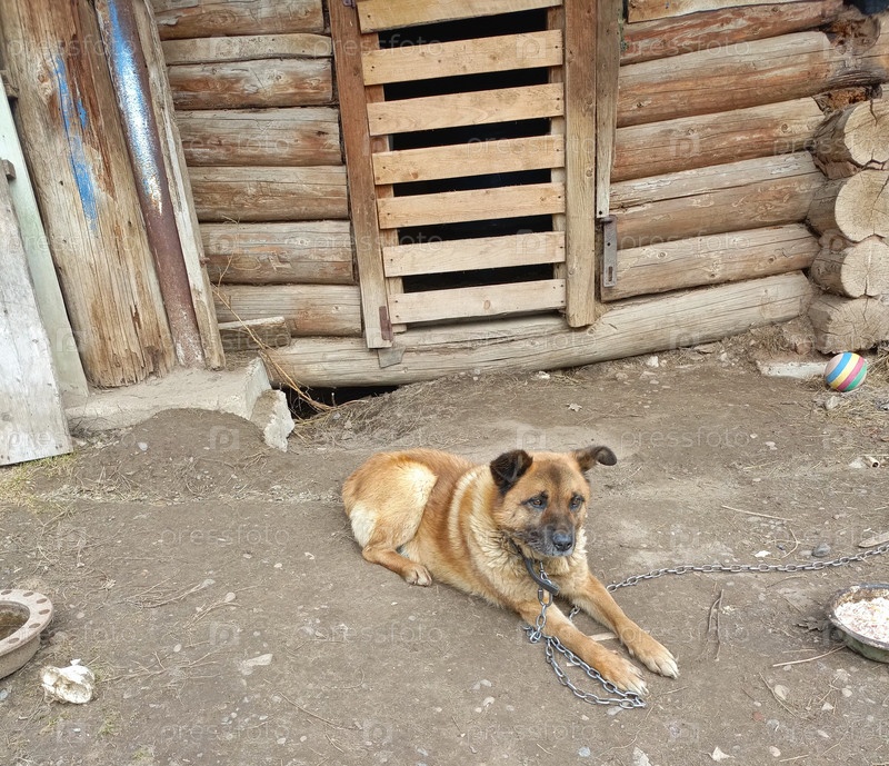 Сторожевая цепная собака лежит на земле, прикованная к деревянной конструкции. Деревенская хижина и земляное окружение отражают мирный сельский образ жизни, показывая аспекты повседневной жизни