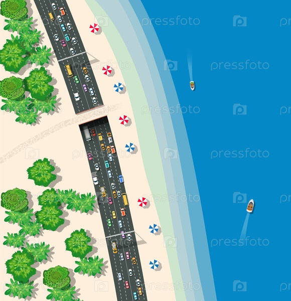 Высокоскоростная магистраль с легковыми автобусами и грузовиками. Вид на городской автомобильный транспорт