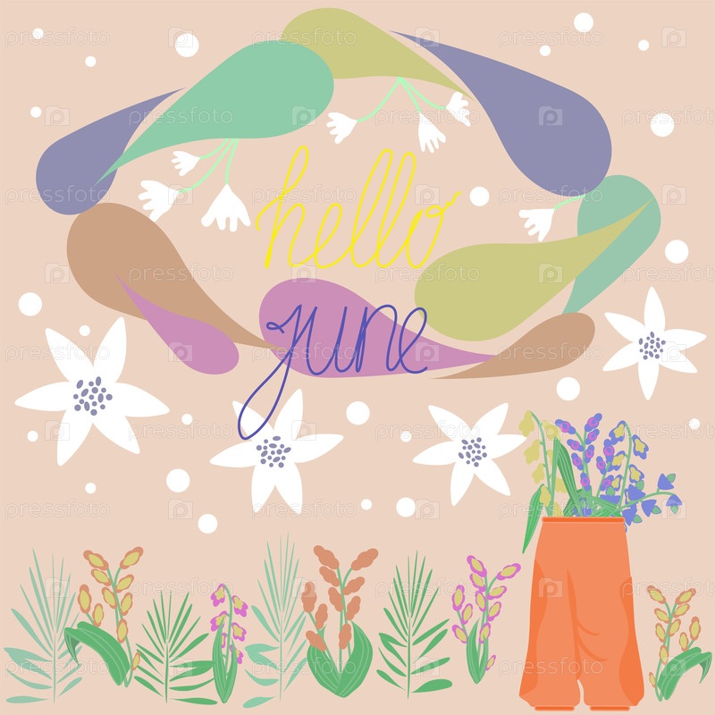 Яркая поздравительная открытка Июнь с изображением букетов цветов в цветниках