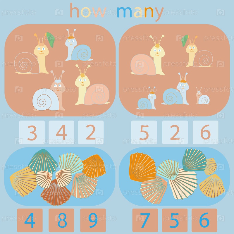 Подсчитайте, сколько улиток и раковин на картинке ребуса для детей до 6 лет