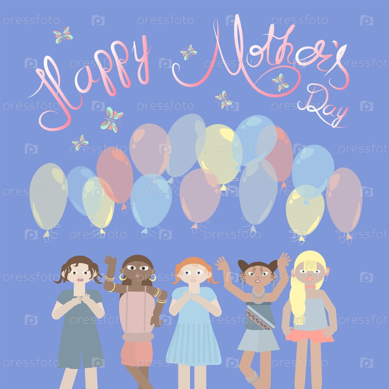 Поздравительная открытка ко Дню матери с изображениями девушек и красивыми воздушными шарами