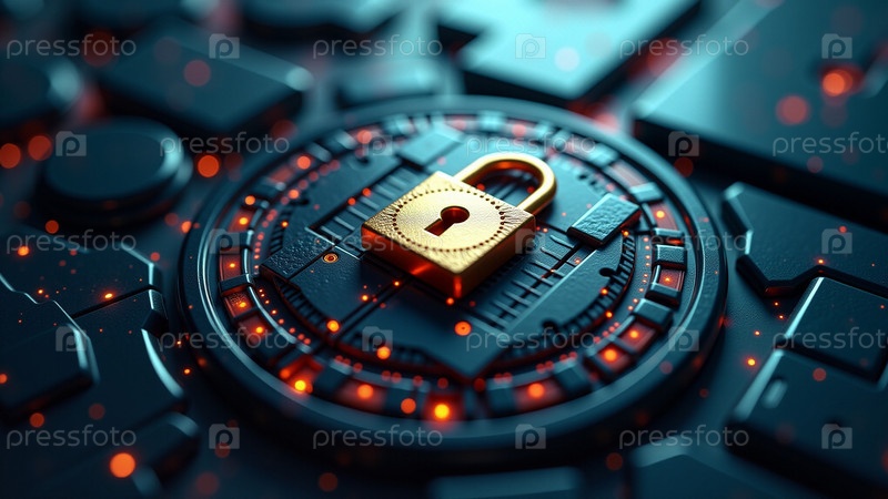 Золотистый замок, защищающий футуристический микрочип: концепция кибербезопасности