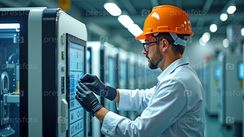 Промышленный инженер в защитных очках и жесткой рабочей технике с использованием сенсорной панели управления на современном заводе