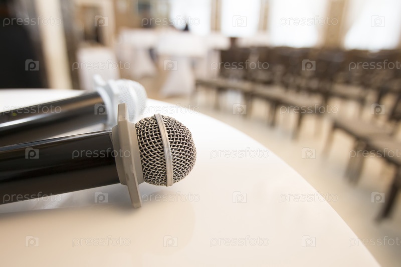 Стол с микрофонами на фоне комнаты с рядами стульев. Пресс-конференция