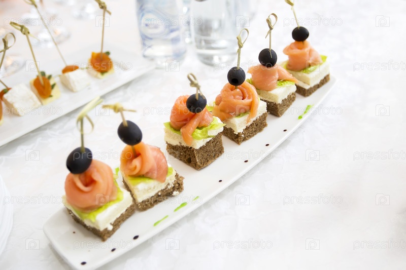 Тарелки для буфета. Канапес на белой пластине. Маленькие бутерброды на палочке. Закуска черного хлеба, лосося и салата