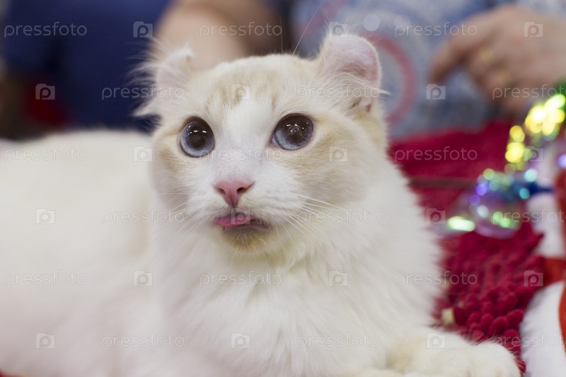 Белая кошка породы American Curl на выставке