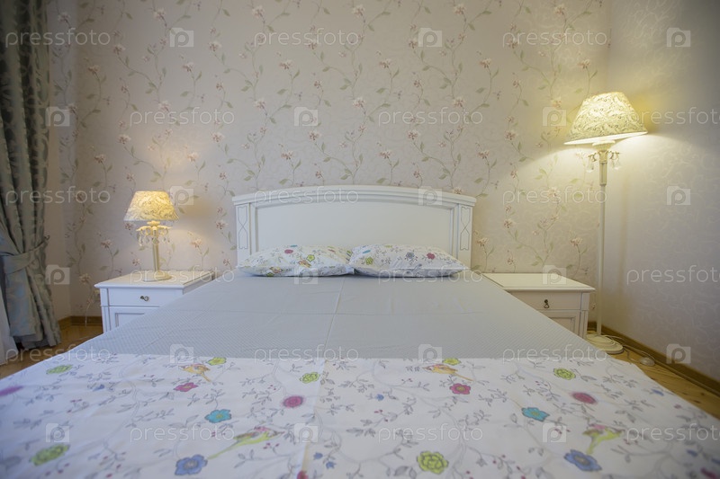 Интерьер с белой кроватью и настольной лампой. спальня