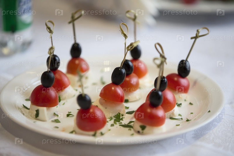 Тарелки для буфета. Кусочки сыра с вишневыми помидорами и оливками