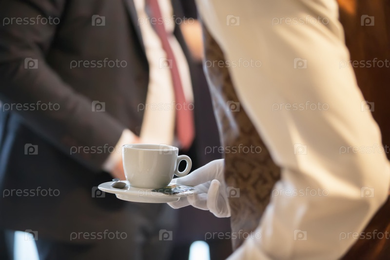Руки официанта с чашкой на фоне мужчины