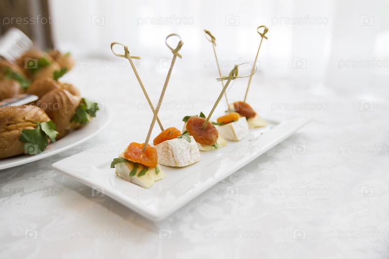 Тарелки для буфета. Канапес на белой пластине. Маленькие бутерброды на палочке. Снек