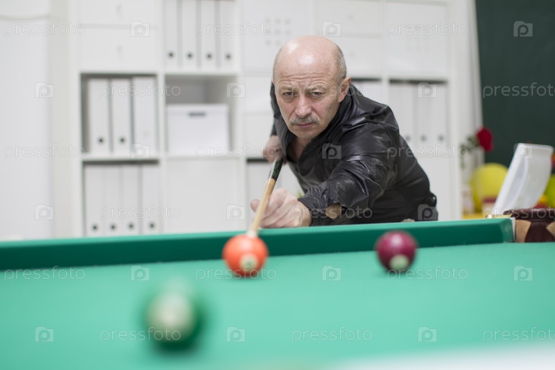 Пожилой мужчина играет в бильярд