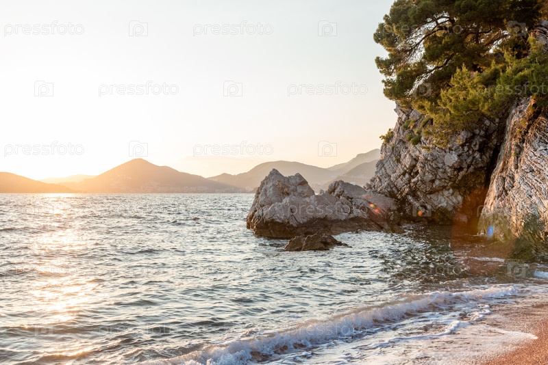 Морское солнце, Адриатика Природные пейзажи морской волны Свети Стефан, Черногория