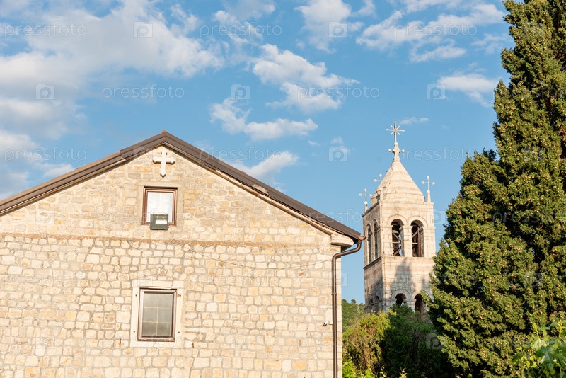 Черногорская православная церковь с куполом и христианским крестом, религиозное строительство верующих для молитв в Петроваце