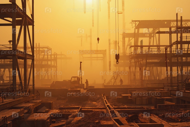 AI генеративная строительная площадка, строительство кранового здания на стройплощадке