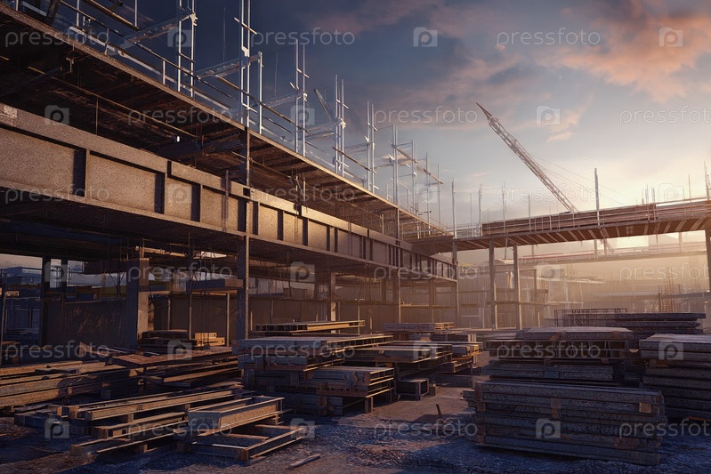 AI генеративная строительная площадка, строительство кранового здания на стройплощадке