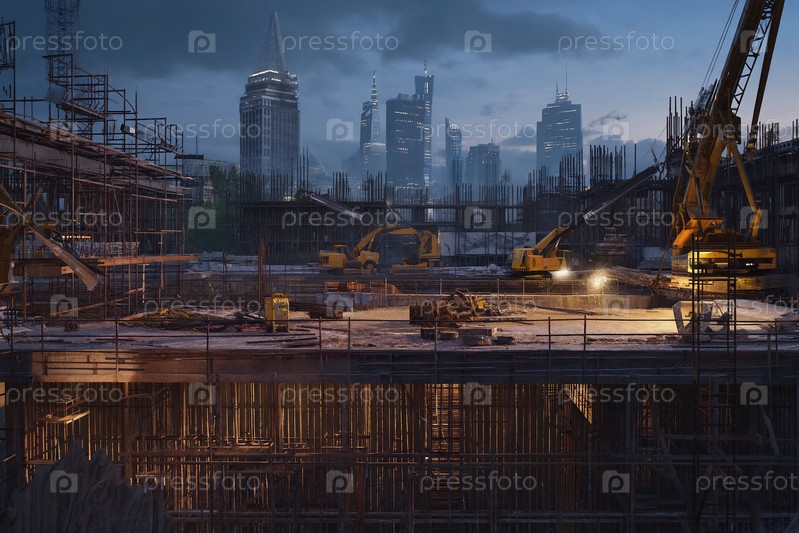 AI генеративная строительная площадка, строительство кранового здания на стройплощадке