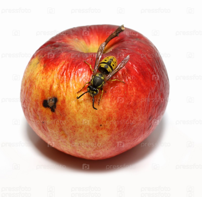 Оса на красном яблоке на белом фоне