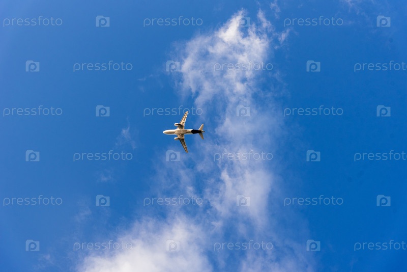 Самолет, летящий на голубом облачном небе, воздушный транспорт, солнечный день пушистые облака