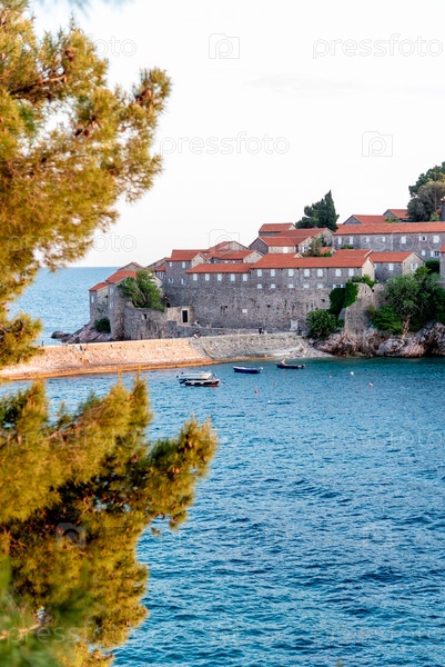 Вид на остров Свети Стефан, морской пейзаж на закате в Черногории