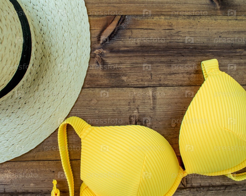 Летние каникулы, Плэтлей. Шляпа и купальник на темном деревянном фоне