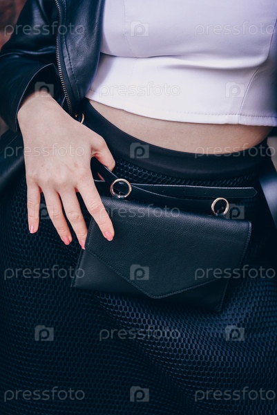 Молодая женщина держит в руках черную кожаную сумку, стильный вид рекламы крупным планом